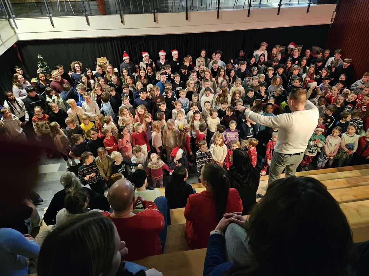 God jul og Godt nyttår!Med bilde av en ivrig rektor Are Antonsen som dirigent for hele Fjordtun skole som synger årets julesang, vil vi ved Fjordtun skole ønske alle en riktig God jul og Godt nyttår! Rektor dirigerer 250 elever Publisert av Idar Helmer Pedersen Sist endret 19.12.2025 12.54