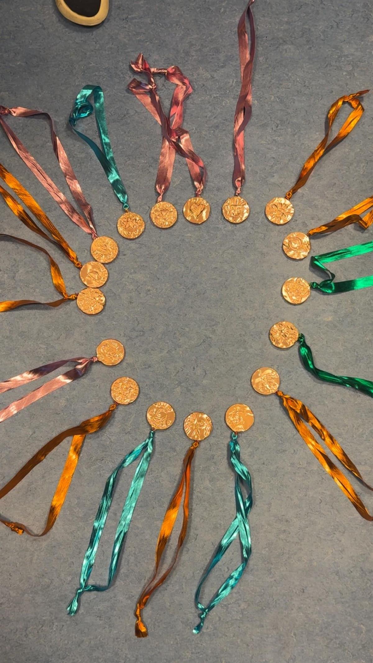 Til slutt skapte hver elev sin egen kobberrefleks, alle med unike mønstre og personlige uttrykk. Sammen dannet de en vakker samling – nesten som en sol av glitrende medaljonger. Fargerike bånd gjorde dem enda mer levende og klare for bruk i mørketiden.