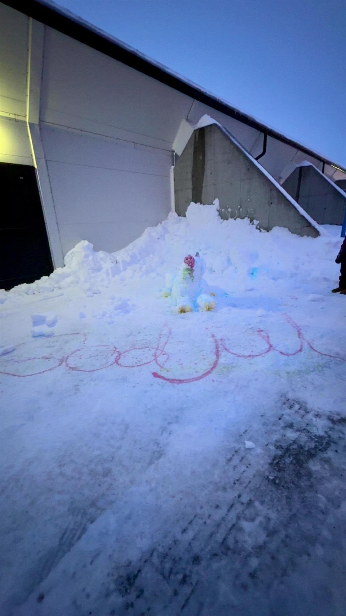 Elevene på ungdomstrinnet koste seg ute i vinterværet, der kreativiteten fikk blomstre. Sammen laget de imponerende isskulpturer, blant annet en lama og en gris til stor glede for både skapere og tilskuere.