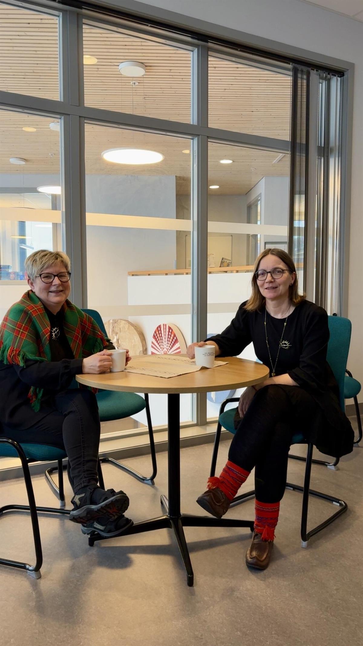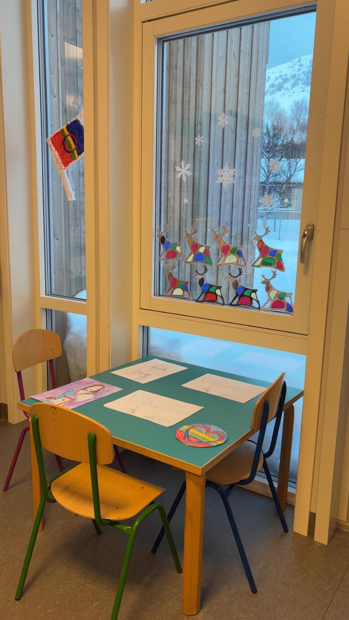 Det er hyggelig å se elever og lærere kledd i samiske klær, smykker og sjal( liidni) i dag. Elevene har også pyntet klasserom og vinduer med samiske flagg, solsymboler og vakre glassmalerier av reinsdyr, fylt med fargene i det samiske flagget. Solen er tilbake, og det er noe vi er ekstra glade for å feire.