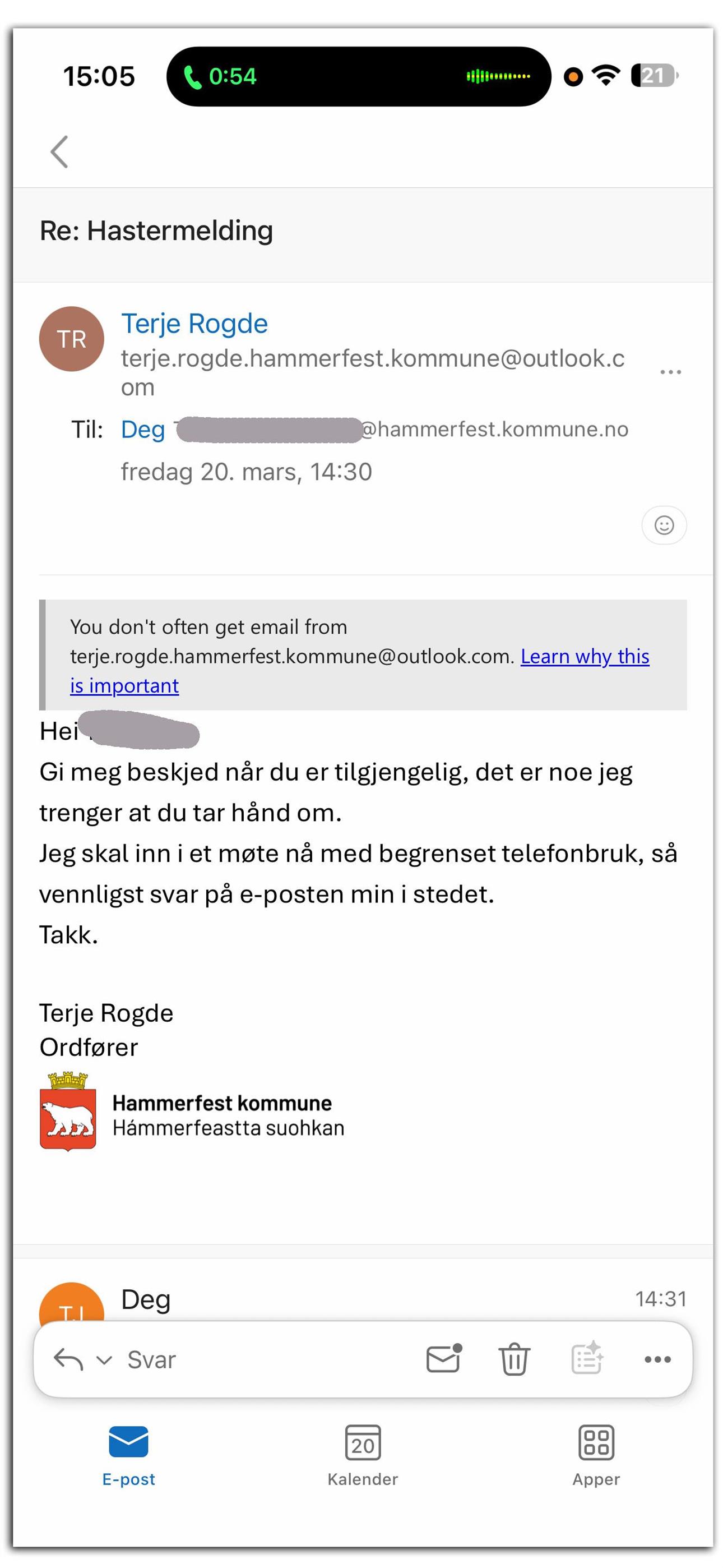 På bildet kan man se at avsenderadressen ikke tilhører Hammerfest kommune. Den korrekte e‑postadressen til ordføreren er en kommunal adresse som slutter på @hammerfest.kommune.no, ikke @outlook.com eller andre domener.