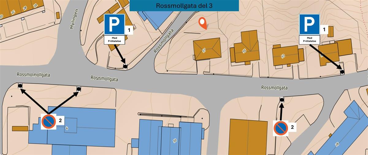 - Områder med «parkering forbudt» og «innkjøring forbudt» midt i Rossmollgata.
